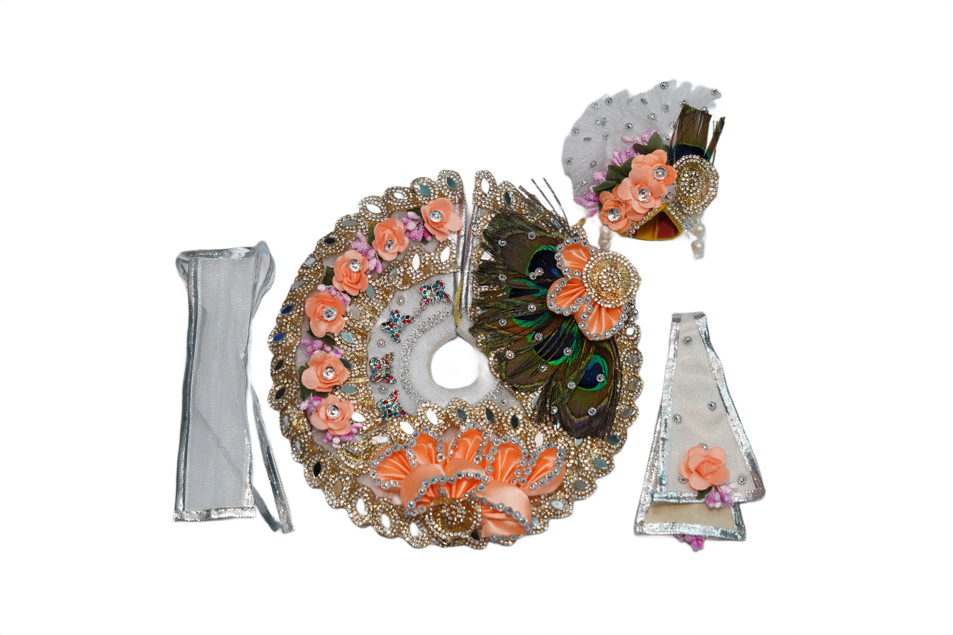 Designer Laddu Gopal Dress – Peach Floral & Peacock Feather Poshak